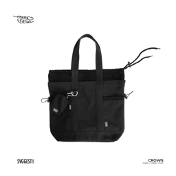 Totebag ini memiliki tambahan coin wallet yang dapat digantung di bagian depan tas dan dua saku samping dengan penutup serut.